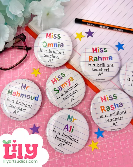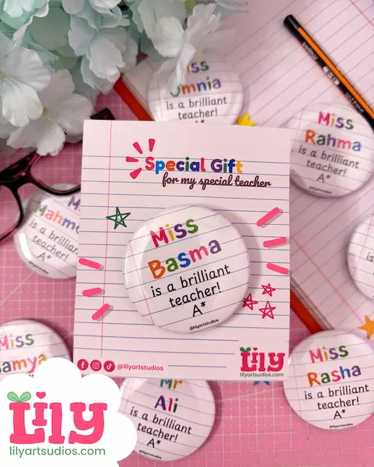 🔸 مخصص بالاسم: بعد ما تعملي الأوردر، هنتواصل معاكي مباشرة عشان ناخد أسماء المدرسين ونجهز الدبابيس مخصوص.