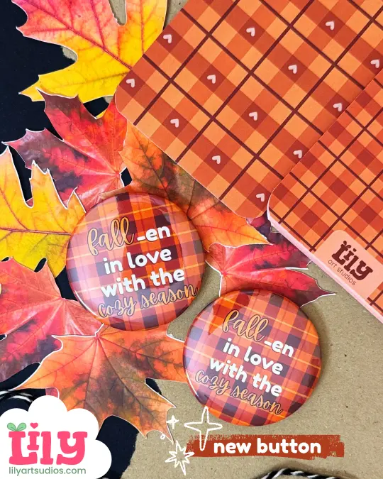 دبوس مدوّر مقاس ٥.٨ سم، بتصميم خريفي دافئ وكلمات تعبّر عن حب الموسم الكوزي بكل تفاصيله ☕🧣